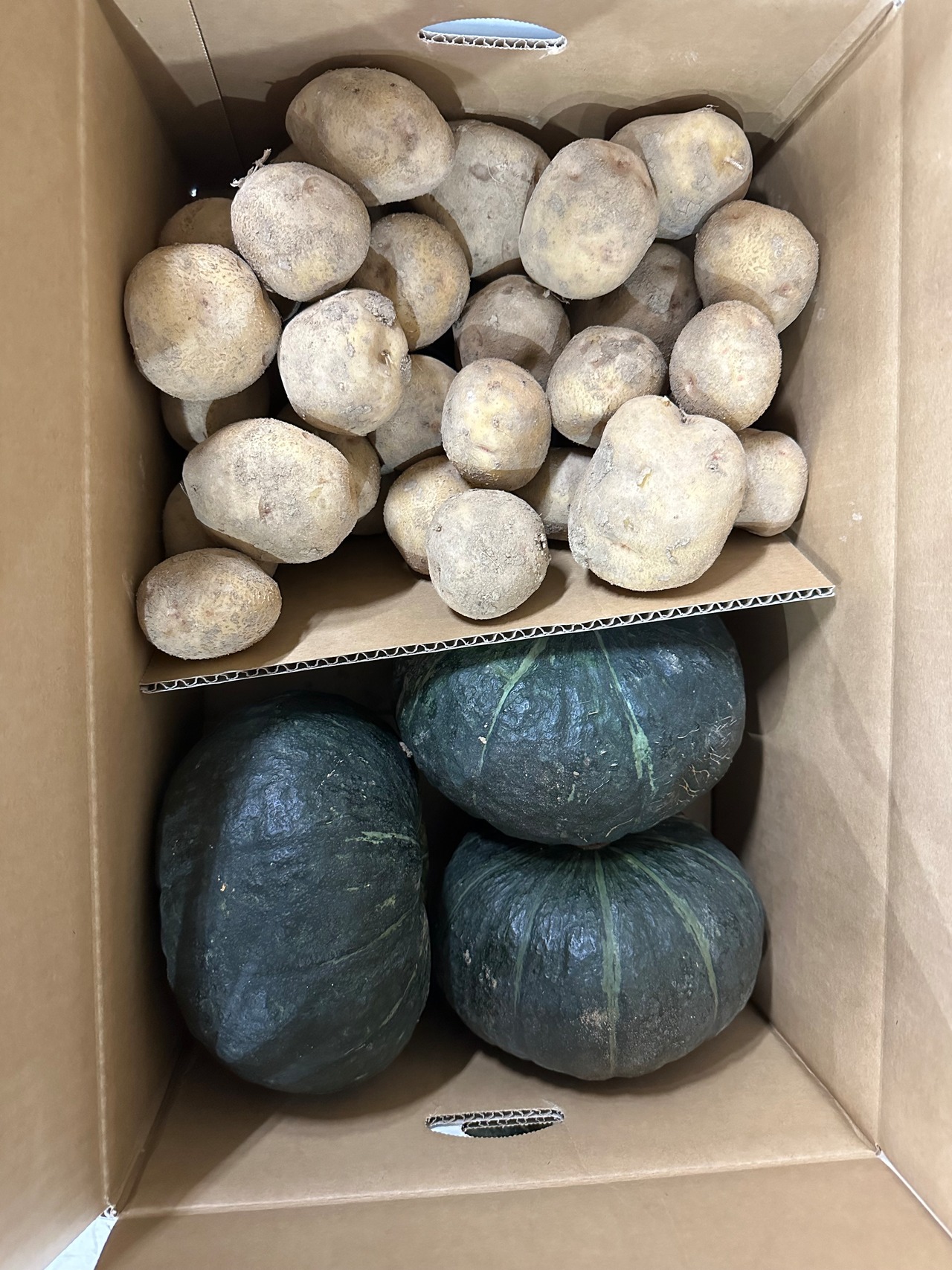 ホクホクで甘みたっぷりの「くりゆたか」かぼちゃ(6玉サイズの中から3玉・約5kg)と、じゃがバターやコロッケにぴったりな「キタアカリ」土付き5kg(サイズバラ)を詰め合わせました。